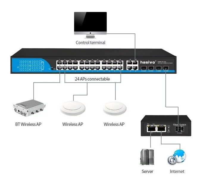 Bằng cách sử dụng Converter quang PoE, chẳng hạn như Planet GTP-805A, hoặc Hasivo POE108GM, các thiết bị nhận nguồn như Wifi AP, Camera IP có thể dễ dàng kết nối giữa các điểm lắp đặt và trung tâm ở xa dễ dàng.