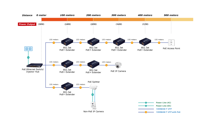 Cứ mỗi khoảng cách 100m bạn có thể lắp đặt được một bộ mở rộng PoE như vậy để mở rộng phạm vi cấp nguồn và dữ liệu thêm 100m. Bạn có thể lắp tối đa 3 bộ nguồn như vậy với công suất đầu vào 30W và tải ra 15W do tổn hao công suất của thiết bị PoE Extender và dây cáp đồng.