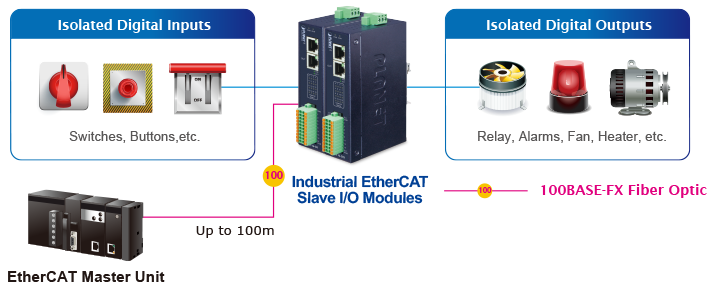 Cả Modbus TCP và EtherCAT đều có ứng dụng rộng rãi trong các thiết bị chuyển mạch cấp công nghiệp (Industrial Switch), đóng vai trò là xương sống của các mạng công nghiệp và tự động hóa. Các thiết bị chuyển mạch này được thiết kế để đảm bảo truyền dữ liệu đáng tin cậy, tính ổn định của mạng và tích hợp liền mạch với nhiều giao thức công nghiệp khác nhau. Hơn nữa, chúng cung cấp các tính năng như dự phòng, ưu tiên và Chất lượng dịch vụ (QoS) để đáp ứng các yêu cầu nghiêm ngặt của môi trường công nghiệp.
